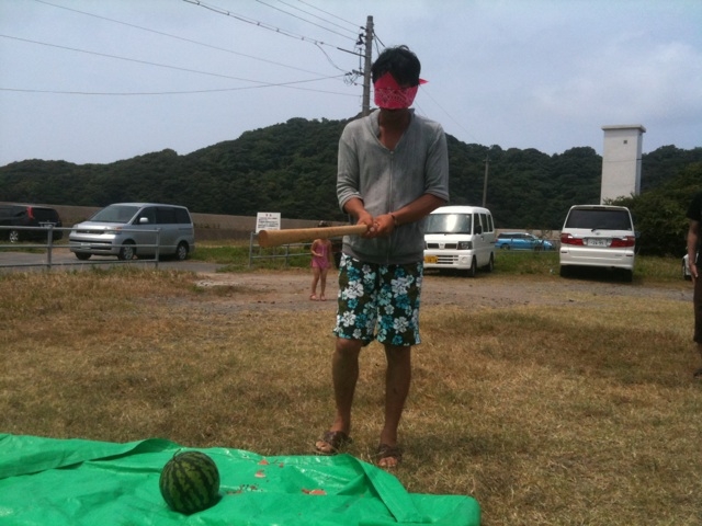僕の上司の網田も子供に混ざってスイカ割りに挑戦♪